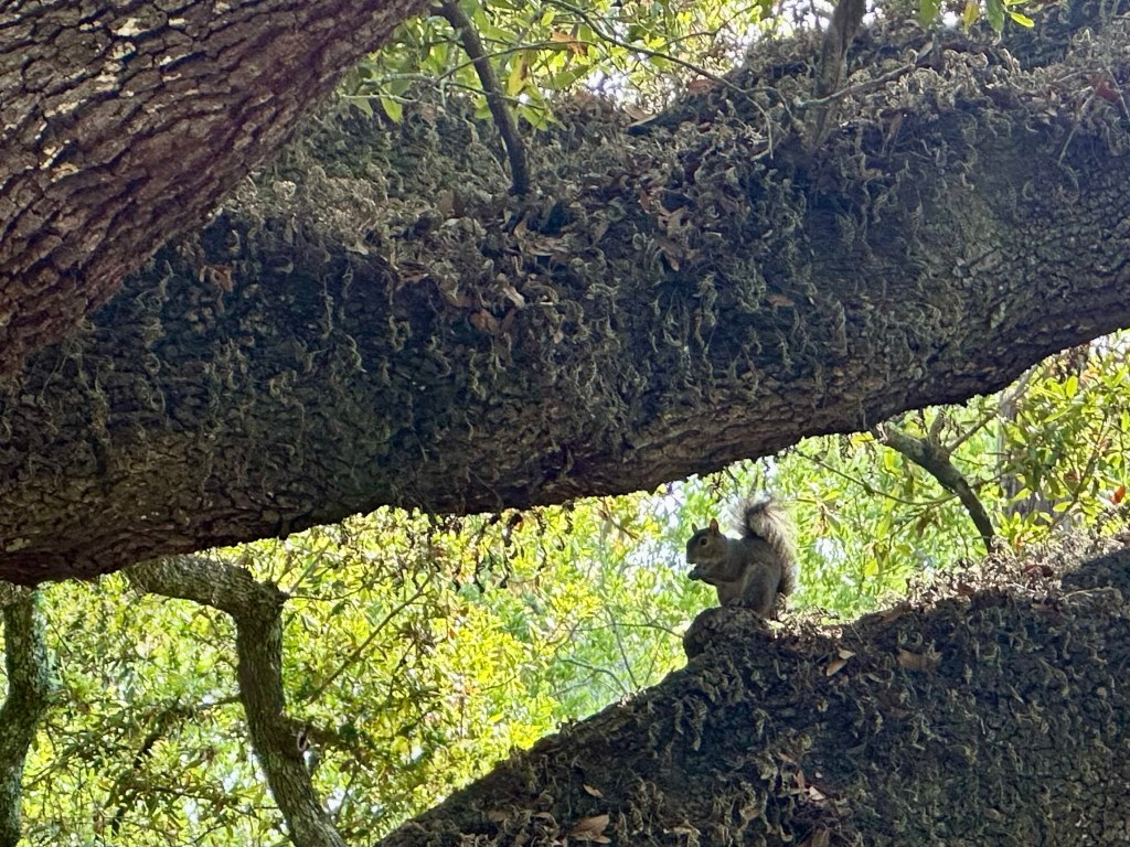 Well, it’s official, we’re in a severe drought, we need rain, rain, rain – but there is none in sight. Everything is getting a tad crunchy. BUT, the crunchy vegetation on the tree is supposed to look like that. It’s called a Resurrection Fern. As soon as we get rain, it will turn green and look like the healthiest fern you’ve ever seen. It makes a dramatic switch from crunchy to stunning, and then a few days with no rain it’s back to this again. It’s quite miraculous if you ask me!