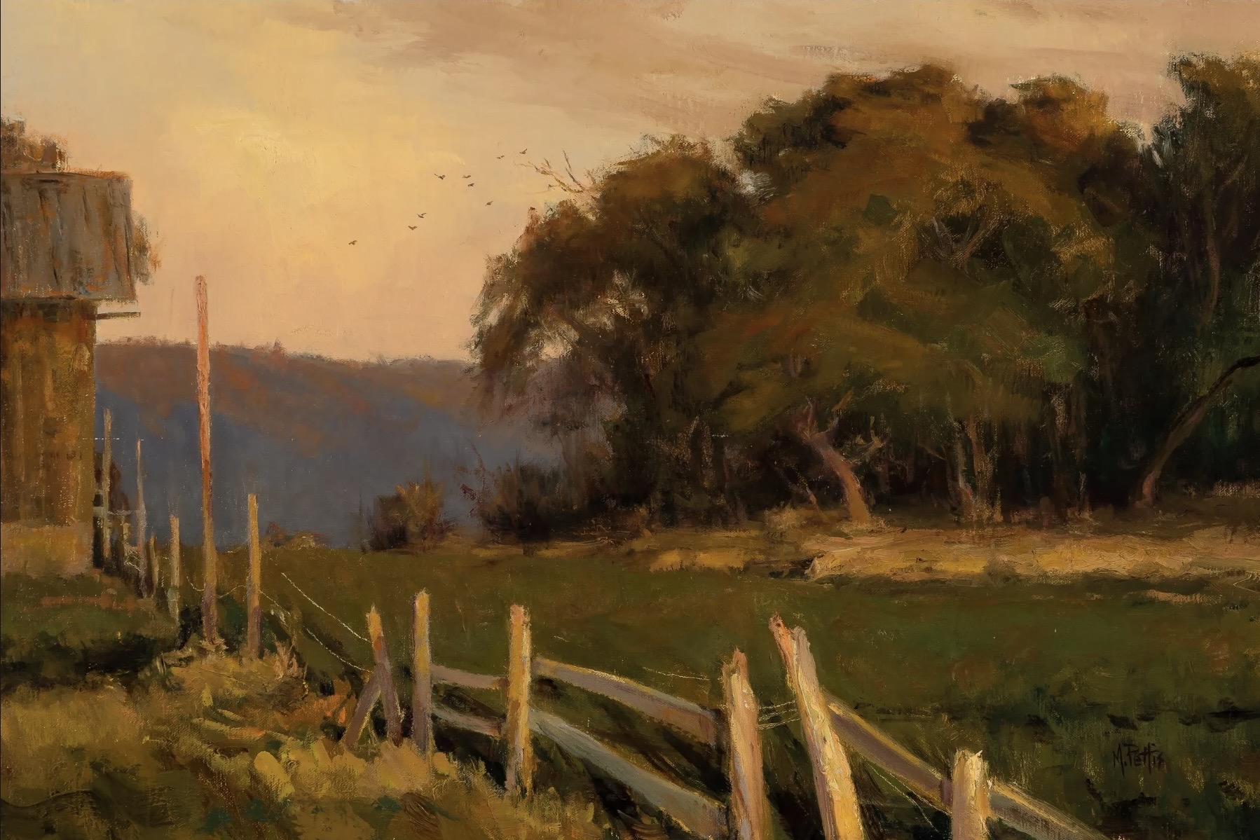 Mary Pettis. She’s a fabulous artist and workshop instructor. Her work is breathtaking, she paints both plein air (outdoors) and in the studio. Just look at the breathtaking light in this scene. The fabulous tree that look like they’ve been there for so long, the fence and of course the crows. Isn’t this a striking painting?