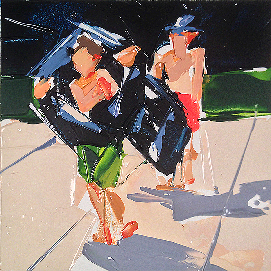 Here is one of my favorites images from an exhibit earlier this year. The image had been with me for a few years and I’ve been waiting for the right time to paint it. The photo was taken at my son’s baseball team’s end of season party at Wekiva Springs in Florida. Lots of sun and fun; lots of color; lots of great photo ops. I always love the opportunity to paint “black”. Though I don’t use tube black. Most artists are taught to mix it so that there’s depth. I use alizarin crimson, sap green, and ultramarine blue. I mix it to lean towards one of the 3, so that it retains some color. It’s the value of it that makes it read as black.