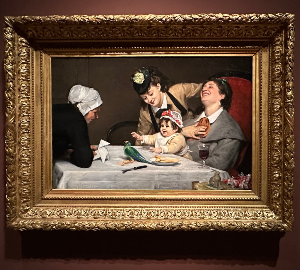 This is such a striking and happy painting. This artist captured the joy, the emotions! The laughter, the sweet child, the laughing women – all fabulous. Add in a bit of the unexpected such as a bird on the table and what a painting! Now, who painted this? #doyouknow