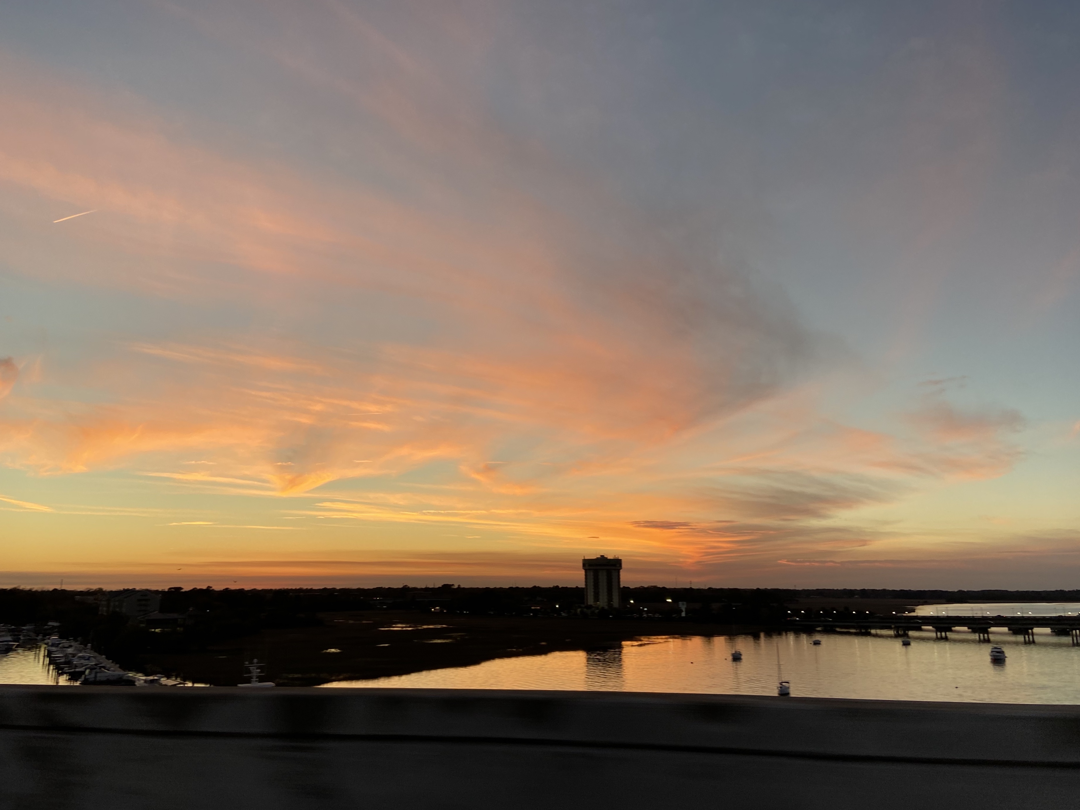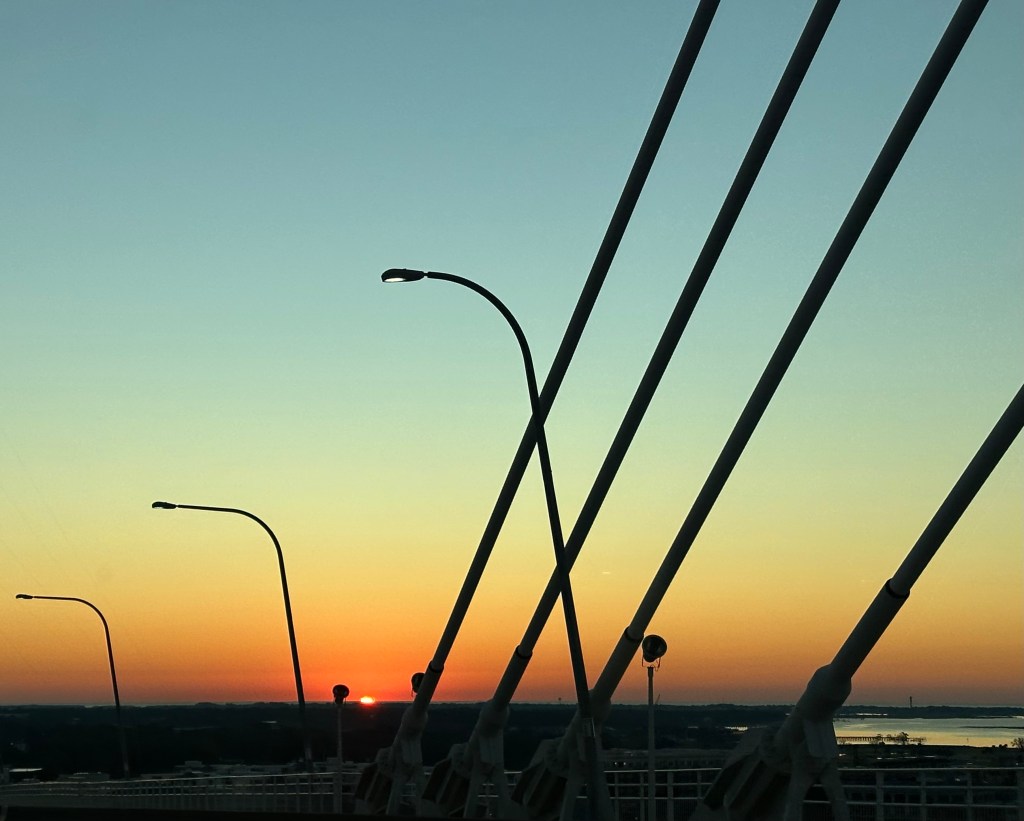 This was an unexpected surprise as we headed over the bridge to Mount Pleasant, SC. We were out early the other morning while running errands. There was such a beautiful color across the horizon and then *poof* the sun appeared and quickly rose. In the span of the bridge we saw it rise considerably. What an awesome way to put things into perspective. Busy days and times are among many of us – take a moment to absorb the quiet and any peaceful scene you may encounter.