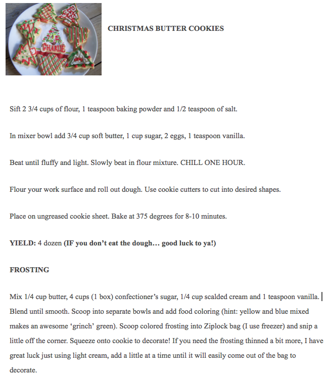 These are the tastiest Christmas cookies in all the land. THE ONES that put the biggest smile on Santa’s face! Perfect for those of you who are uber creative! Each cookie is a blank canvas and you can get as fancy as you like… or you can just squeeze on the colorful frosting, and that’s beautiful as well! The recipe has been in our family since I was teeny tiny and has become a yearly tradition! My parents found it in a magazine… wonder which one? Click here to read the last post about these wonderful cookies!