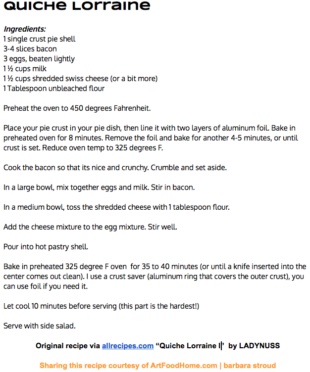 Quiche Lorraine. This is one of my favorite recipes, because you can change it so that you use what ingredients you have on hand. Although, I have to say, I always go back to the bacon and swiss… the combination is out of this world. Serve this with a side salad, some wonderful baby greens, avocado, and a drizzle of olive oil/rice wine vinegar and oh la la!