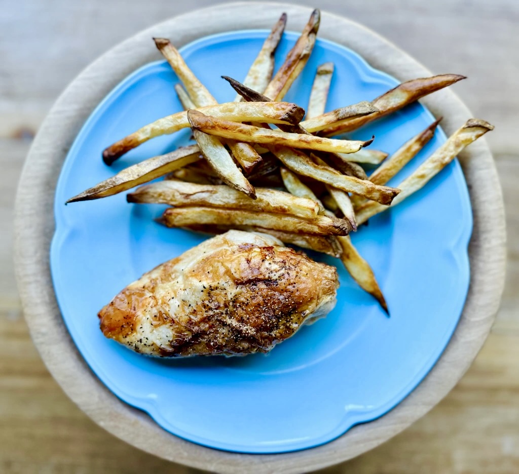 My husband loves baked chicken. “What would you like for dinner?” Baked chicken. Nearly every time. He loves the crispy skin which tastes like fried chicken. I use bone in/skin on chicken breasts. Rub with olive oil S&P and pop into the oven at 350℉ for an hour. But what to go with it? Oooh! I know! Crispy baked potato fries – they were as gorgeous as they were delicious. Here’s how: