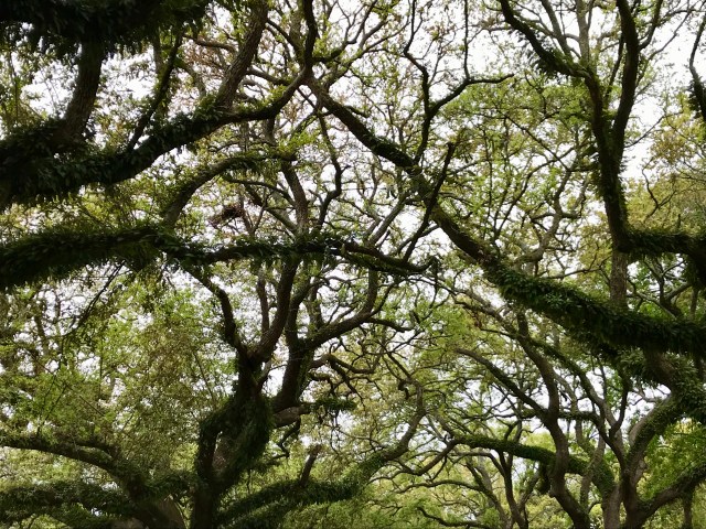 The Charleston, SC live oak trees are something to be treasured. In this photo, I shot upward. The limbs form a canopy over the road which is magnificent, especially on hot days! There is enough shade to walk laps (one time around the block is 0.8 miles) and for the most part stay out of direct sun. It also helps if you get caught in the rain, the trees shield you from regular rain – but not hard rain.
