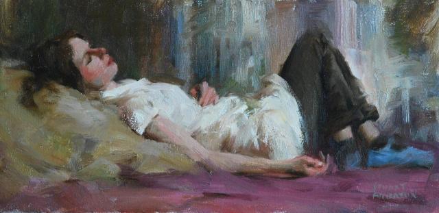 The first featured artist in this series is Stuart Fullerton, the above painting was juried into American Impressionist Society 2012 Exhibition, great job! I really like the brushwork in this painting. Short strokes, thick paint, nice and loose. Stuart has a fabulous website, I encourage you to check it out. He paints oil, watercolor, gouche, and pastel. Can’t you just feel the peacefulness in this painting? No sharp edges, lovely background… very nice… I can almost hear the woman take deep breaths as she’s resting…