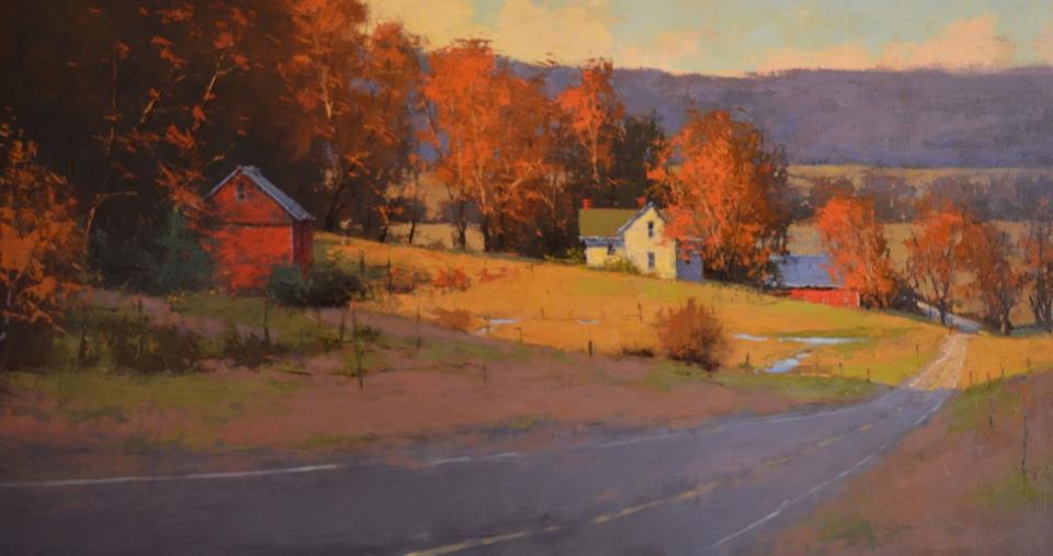 This painting has such a nice autumn feel to it. I feel like I could be driving down this road on the way to the cider mill to get some wonderful crisp apples, a glass of cider and one of those wonderful little cinnamon sugar doughnuts to go with it. All that happiness squeezed in to this painting and no calories! I could look at this painting all day… the wonderful warm colors, the shadow and light, the distance that you feel… nice! This painting is at ART ON THE BOULEVARD in downtown Vancouver, WA. There is a first Friday reception November 1, 2013 from 5-9PM. If you’re in the area check it out, otherwise check out Romona’s website!