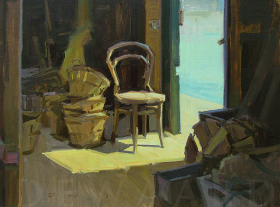 I always like to see what it is in a painting that draws me in. In this case it’s the overall feeling that I get from it. Peace and quiet, good wine, maybe a bit of cheese and a hunk of good bakery bread. Silence. The sunlight peeking through the tree dancing on the slats in the back of the chair… and on the ground like fireflies… I think I need to get my paint out so that I can start making some money to make this dream a reality… ha ha… This would be a nice surprise!