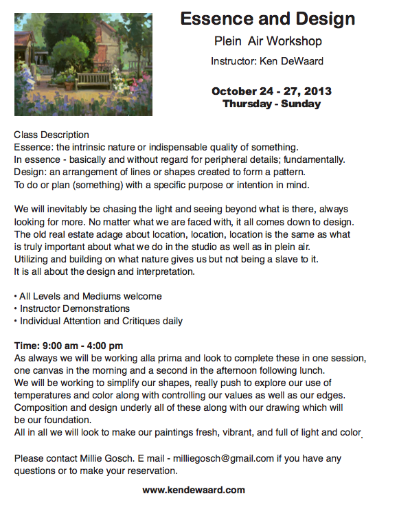 Here is the information on the plein air workshop “Essence and Design”… it’s not until next month, so here’s a heads up…