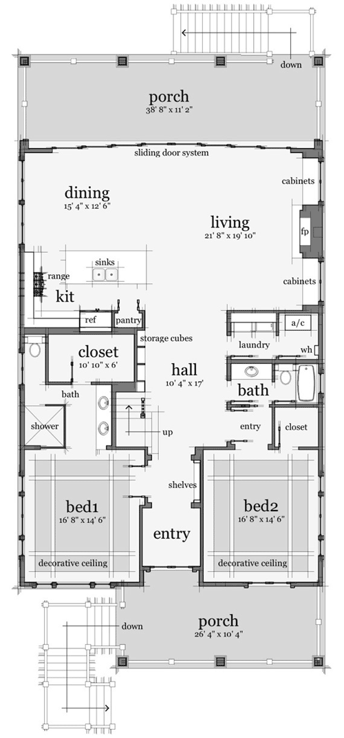 As you can see by the sliding door system, this plan optimizes the use of windows to capture the view. That feature coupled with the wonderful deep porches makes this quite the perfect home… and if that isn’t enough, if this plan is a bit too large for your needs, they have created another plan that is a bit smaller and it’s fabulous! Plan W44116TD: Low Country Beach House (1,581 square feet) – personally, I would go for this one!