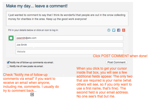 Once you place your cursor in the box you will see a few more things. Ways to show me who you are. You have the option of entering your email address (that no one who reads comments will see, only I will see it), and the name that you want to appear to anyone who reads comments. You also have the option of signing in with WordPress [if you have a blog], Facebook, Twitter and Google +). Then click the POST COMMENT button. As soon as I look at the comment to make sure you aren’t a spammer it will appear. You can also click a box so that you receive an email with all comments on that post, mine included…