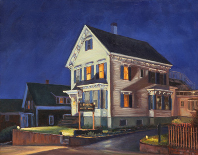 “What makes this painting of the Bradford House unique is that it was painted entirely ‘plein air’ — that is, outside, at night, directly from life. The first night a street light was utilized as light source. Before the second night’s painting session I decided a bedside night reader LED lamp would very helpful! And indeed it was. Some nights the fog would roll in while I was painting, giving the buildings an eerie glow. And water could be poured out of my palette by the end of the evening.”