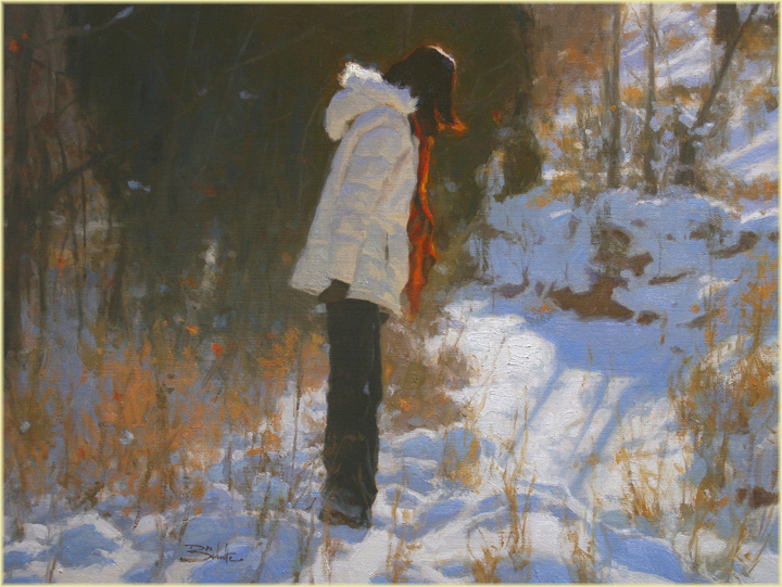 The light in this painting is absolutely incredible. The way the sun touches the snow… lovely. The sunlight on the top of this woman’s hair and on her hood STOPPED ME IN MY TRACKS. The wonderful light coupled with the shadows on the snow makes for one beautiful painting! The artist is Dan Schultz. “Looking Below” is part of the Oil Painters of America Western Regional Exhibition at Gallery 1261 in Denver, CO (say that three times fast!). That is going to be one fabulous show… if you’re in the Denver, CO area I would be hightailing it over there if I were you! If, like me, you are no where near Colorado, check out Dan’s website (as well as the gallery)… you won’t be disappointed!