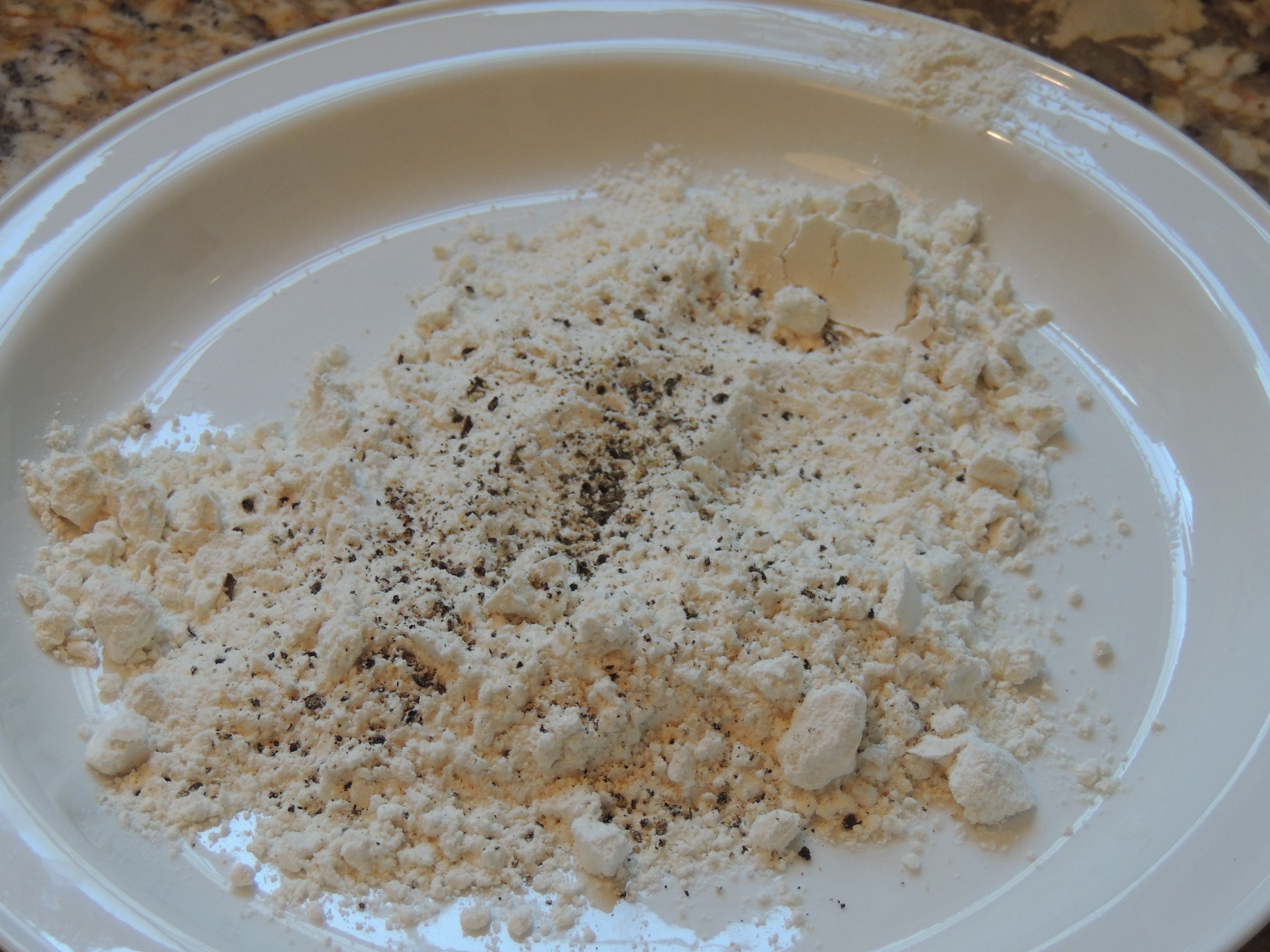 In a plastic zip bag or on a plate, add a few spoonfuls of all purpose flour (I always use unbleached), add salt and pepper.