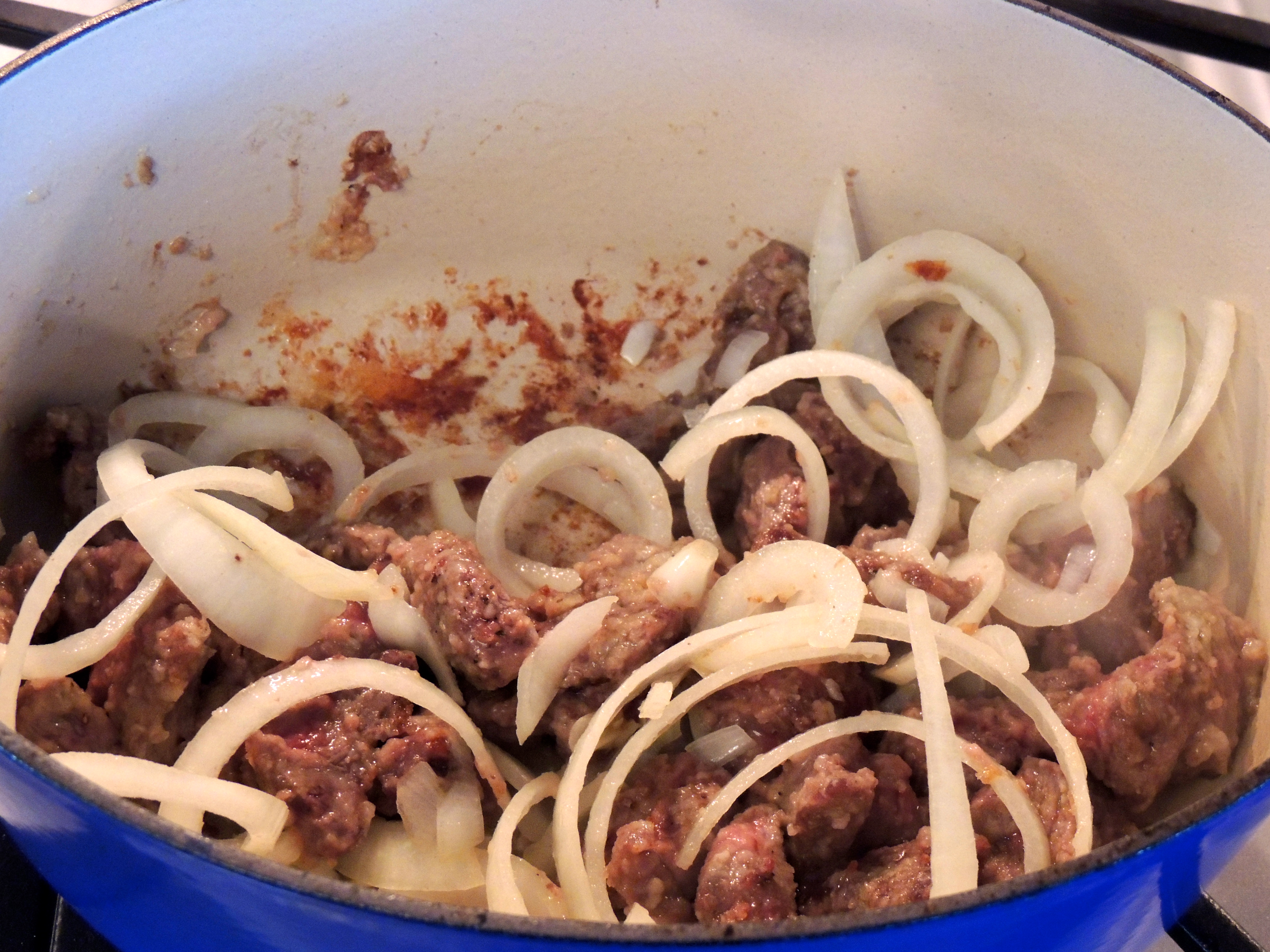 Now is the time to add some beef broth and Worcestershire Sauce (at this point you can also add some red wine if you like). You can use all beef broth or part beef broth and part water. The amount will depend on how many veggies you added… you’ll want to almost cover it… Stir it around and loosen up all those tasty brown bits that are stuck to the bottom of your pot. They add some heavenly flavor!