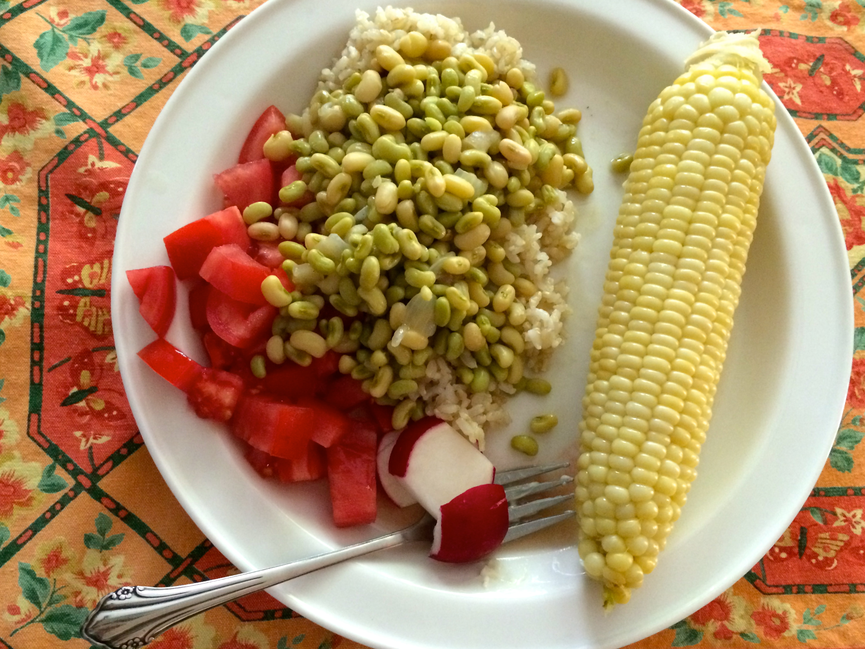 Dinner was too good for words… brown rice, butter peas, radishes, corn on the cob (all from the farmer’s market)… and a few slices of baguette from the bakery near us (Normandy Farms) with some brie from the farmers market.