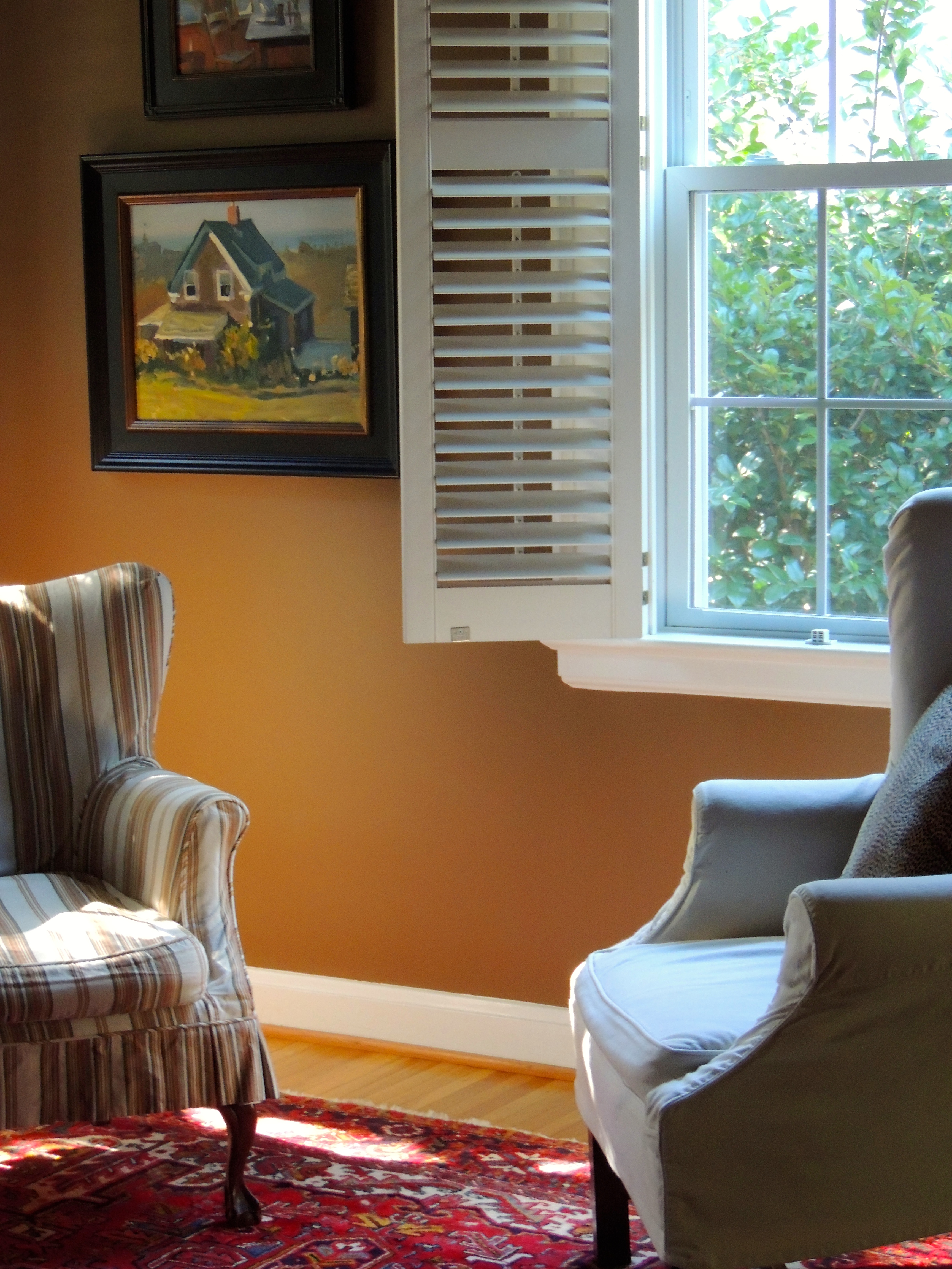Here is the view from the living room (a more updated brown) to the study (the old Kuba color)… so need to pick a color that flows… as well as a color that looks great in a room that gets bright sun…