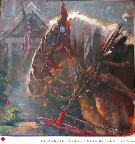 I try my best to select a painting that is for sale instead of one that is already sold, but I just think this is the sweetest painting. This is done by artist Elizabeth Pollie of Harbor Springs, MI. After reading about her, and the different locations that she paints, I was so pleased to see that she paints scenes of Mackinac Island, Michigan! I had vacationed on Mackinac Island this year, and this painting is reminiscent of that trip… This looks like the horses on Mackinac Island. I love the flag in the distance, the light in the horses mane. Excellent. Not typical at all. I often wonder why there aren’t more galleries on Mackinac Island. Why aren’t there artists with easels set up everywhere like on Monhegan Island, Maine? It baffles me. I think it would be an awesome adventure (once my husband retires) to pack up, buy a place on the island and open a gallery. Invite our artist friends to paint on the island and show their work… whoa! Who could pass that up!? I love to dream!