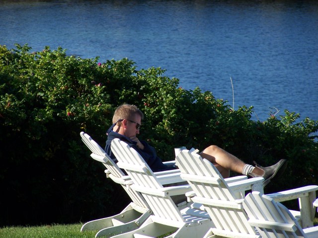 Monhegan Island, Maine – Island Inn Adirondack chairs… Fred reading while he waits for me…