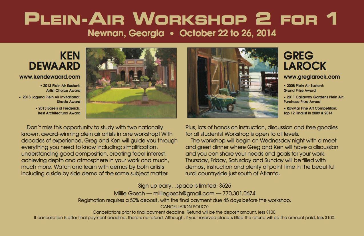 Do you see what I see? A workshop by two amazing artists… a 2 FOR 1 workshop! Ken DeWaard and Greg LaRock – If you’re going to be anywhere near the Newnan, GA area, I wouldn’t miss this for the world. Two highly respected, award winning artists who will guide you through learning how to to take your paintings to the next level. I love how they’re starting this workshop with a meet and greet dinner, so that participants have a chance to get to know each other, as well as Ken and Greg – this is where the information gathering will take place! Key to a good workshop!