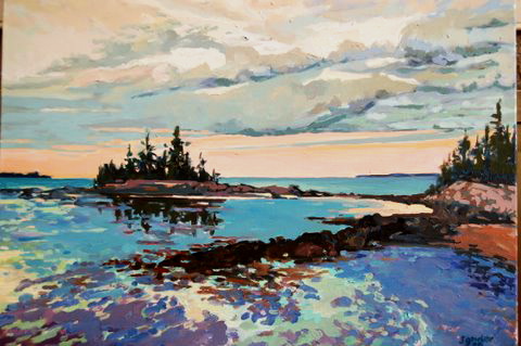 I always painted plein air when our children were growing up, especially enjoying Maine and the Maryland countryside. I now am a full-time painter, and maintain a warehouse studio in Baltimore, but mostly prefer to paint on location. I love to paint on Monhegan island, Mt Desert island, New Mexico and Maryland. I am influenced by the artists Arthur W. Dow, Fairfield Porter, Wayne Tiebolt, Neill Welliver, Eduard Vulliard and others. I am most attracted to places in nature where light is creating abstract shapes, and color is creating a mood. Capturing fleeting light is always a challenge, and a thrill when occasionally it works in a painting! When painting, or even seeing that spot that pulled my attention, I am drawn to unexpected movements of light and beauty.