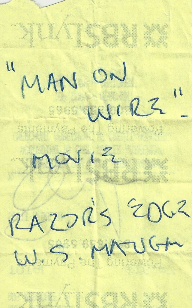 I found a North End Market receipt in my “Monhegan” book, Scott had written down the name of a movie he really enjoyed, called MAN ON WIRE. As well as a book, RAZOR’S EDGE by W.S. Maugham. I haven’t gotten around to either, but I think we will make a point to do so. A tribute to our friend…