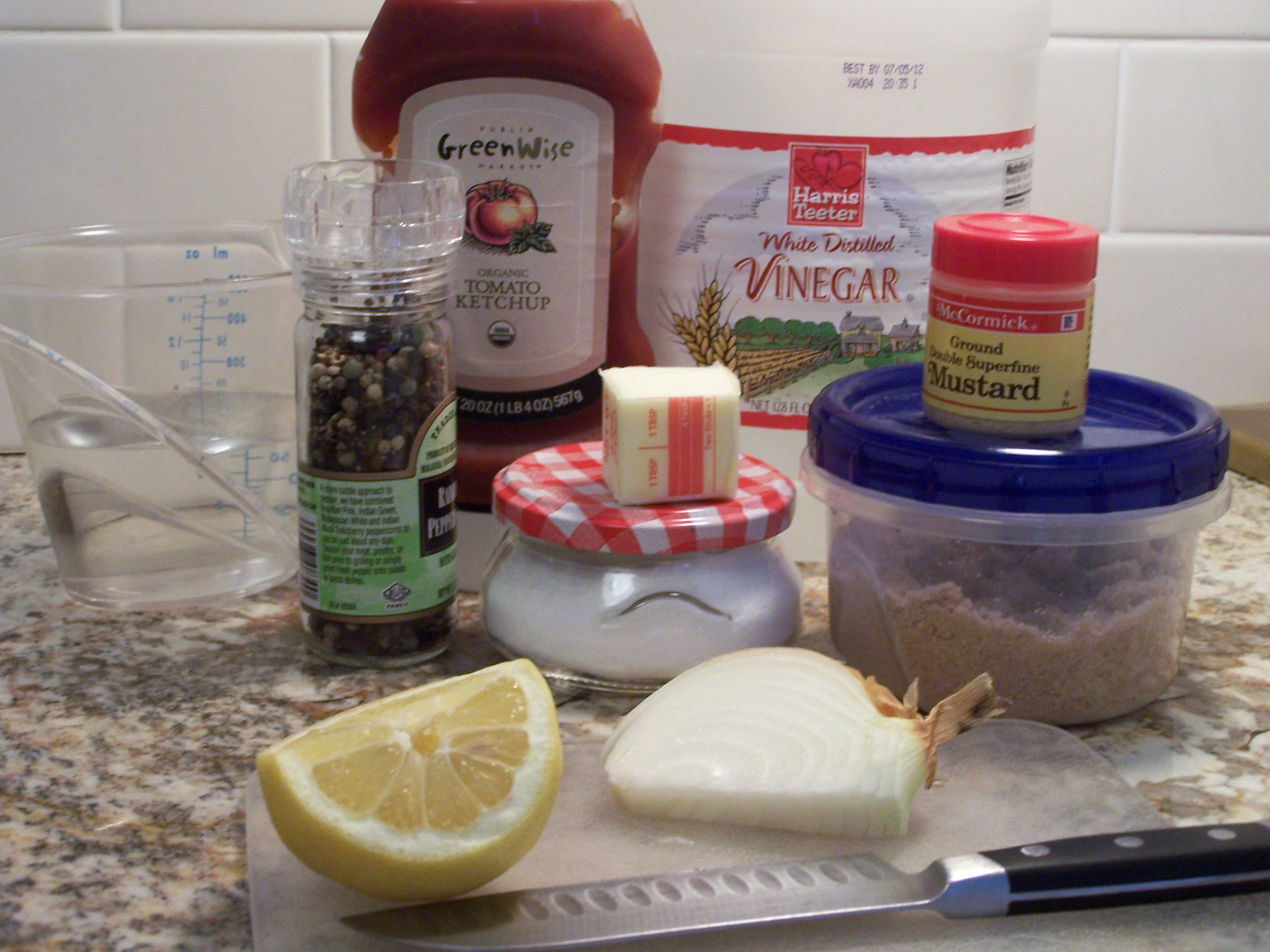 2 tbsp. butter 1 c. water 1 c. ketchup 2 tbsp. vinegar 1 tsp. salt (optional) 1/4 tsp. pepper 1/4 c. onion, finely chopped 2 tbsp. Worcestershire sauce 2 tbsp. lemon juice 2 tbsp. brown sugar 1 tsp. dry mustard powder