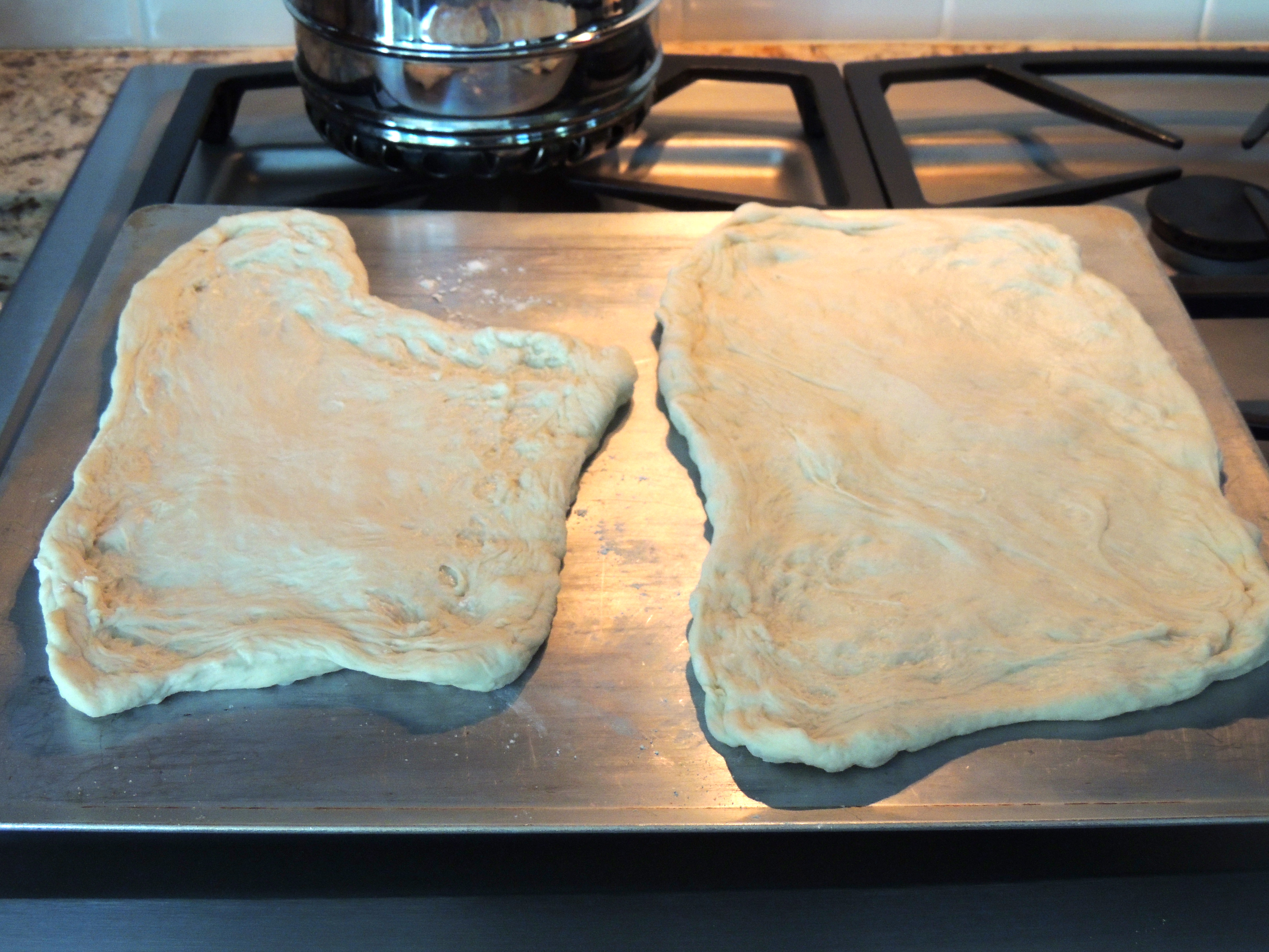 Shape them how you like, they don’t have to be round… I like my funky shapes… Place them on a rimless baking sheet or an upside down cookie sheet. If the dough seems sticky, dust with a little cornmeal or flour…