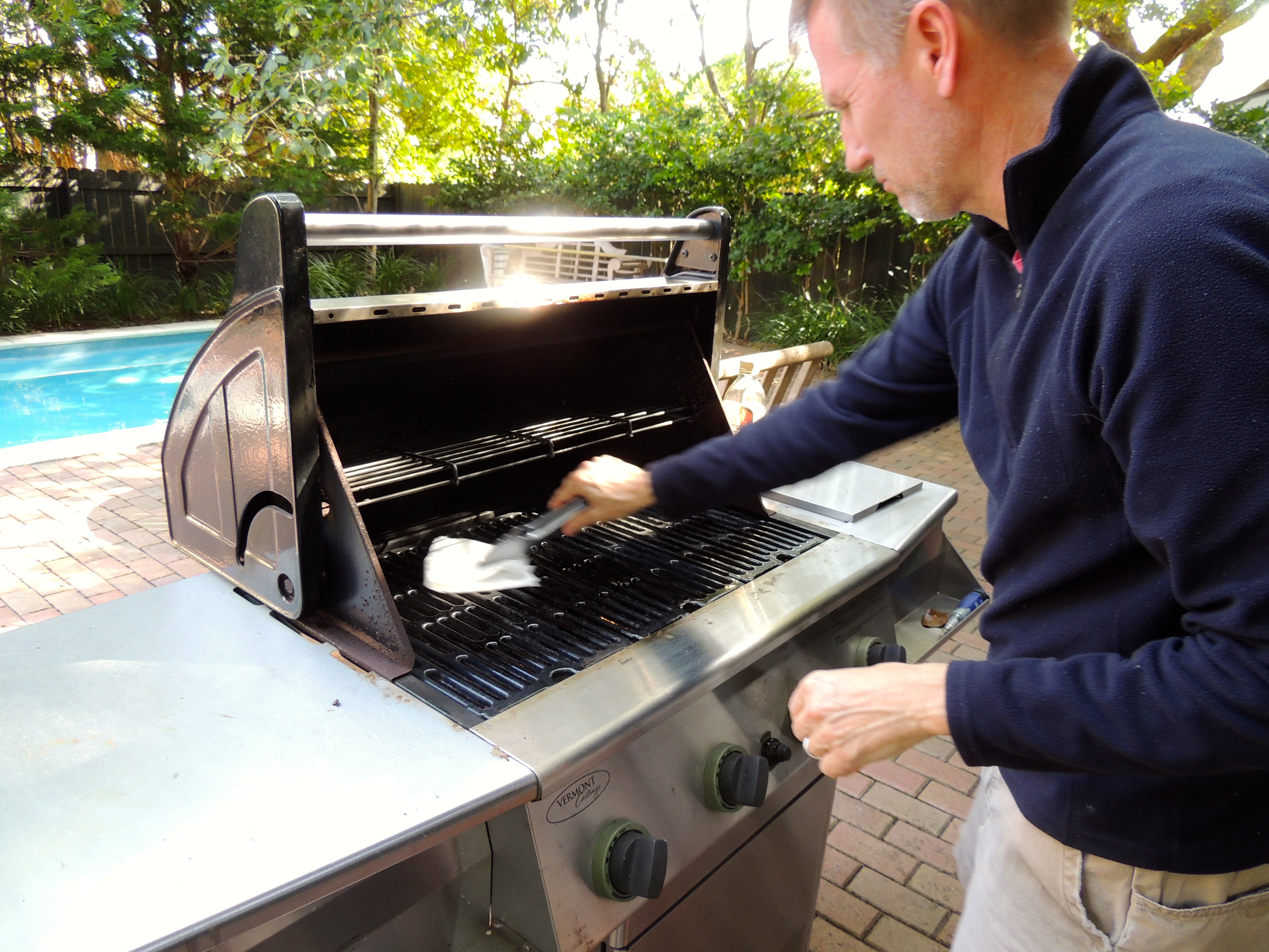 Once the grill is hot, oil the grates with olive oil. We used paper towels dipped in olive oil and used tongs…
