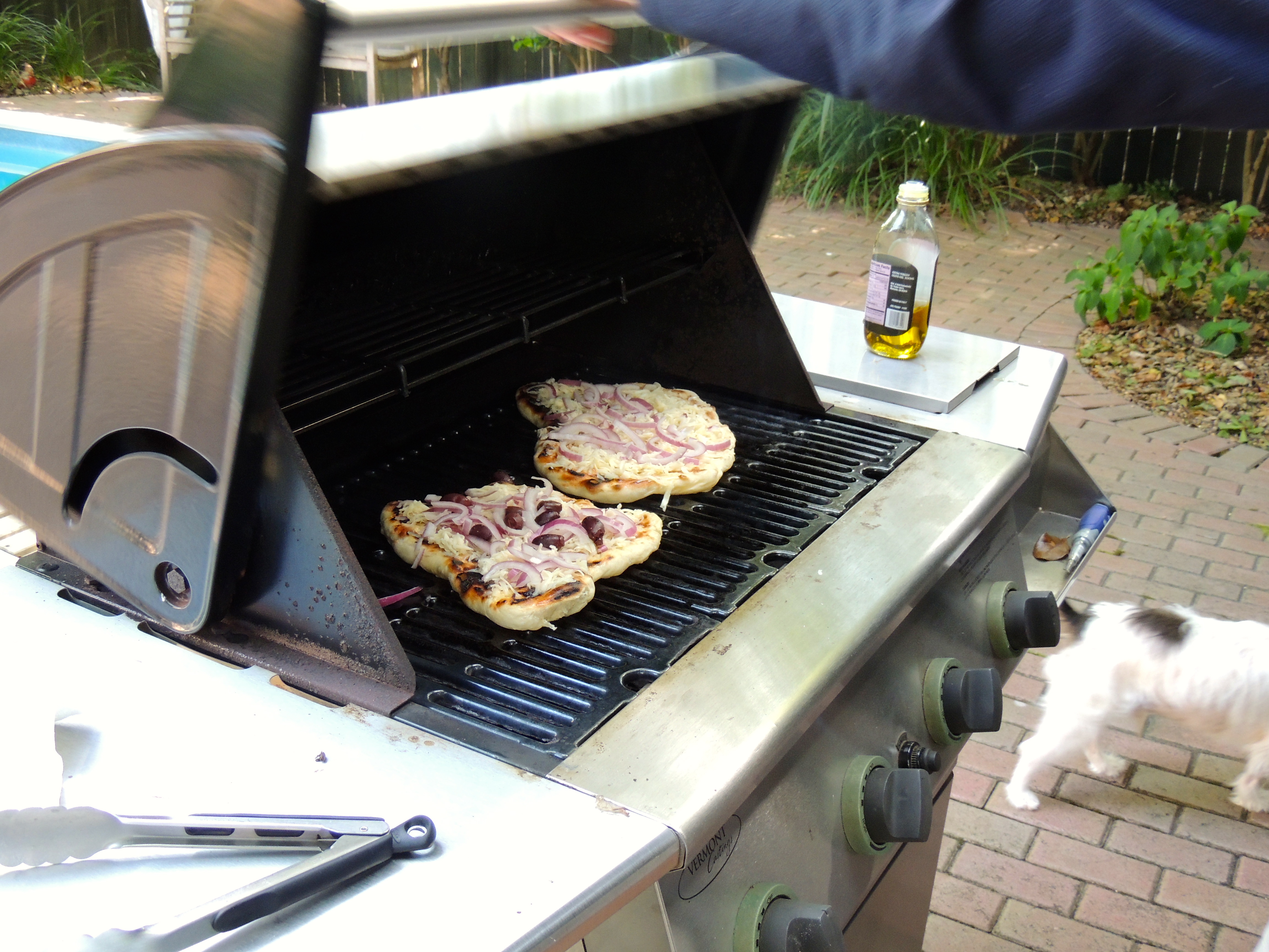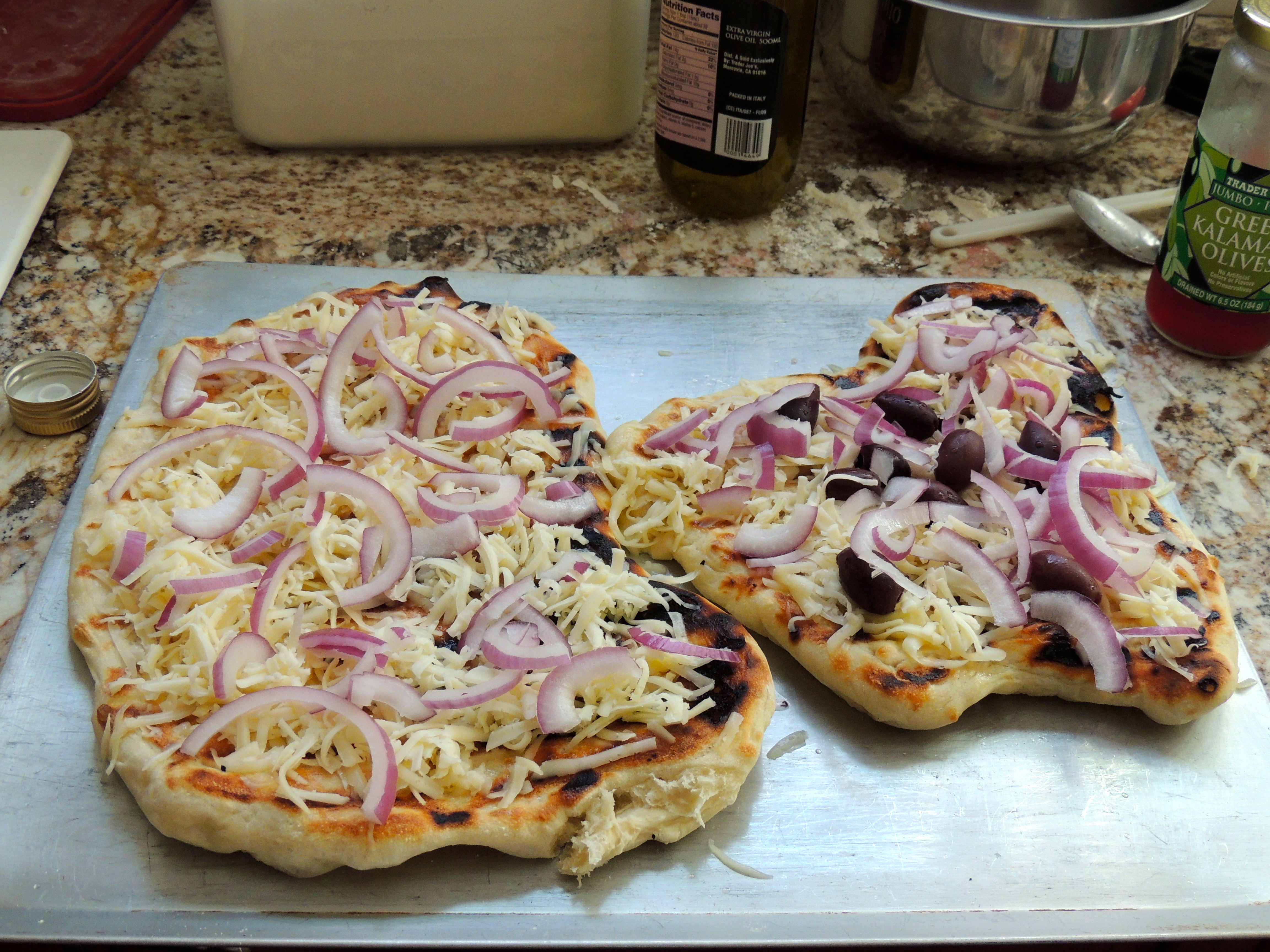 Make a mad dash to wherever your toppings are located, hopefully nearby… place the toppings on the cooked side of the dough. Add sauce or olive oil, then cheese, veggies, meat, but go lightly on top or it will be soggy and heavy. This one was made with olive oil instead of sauce, asiago cheese (Trader Joe’s!), red onion (next time I would sauté first) and olives.