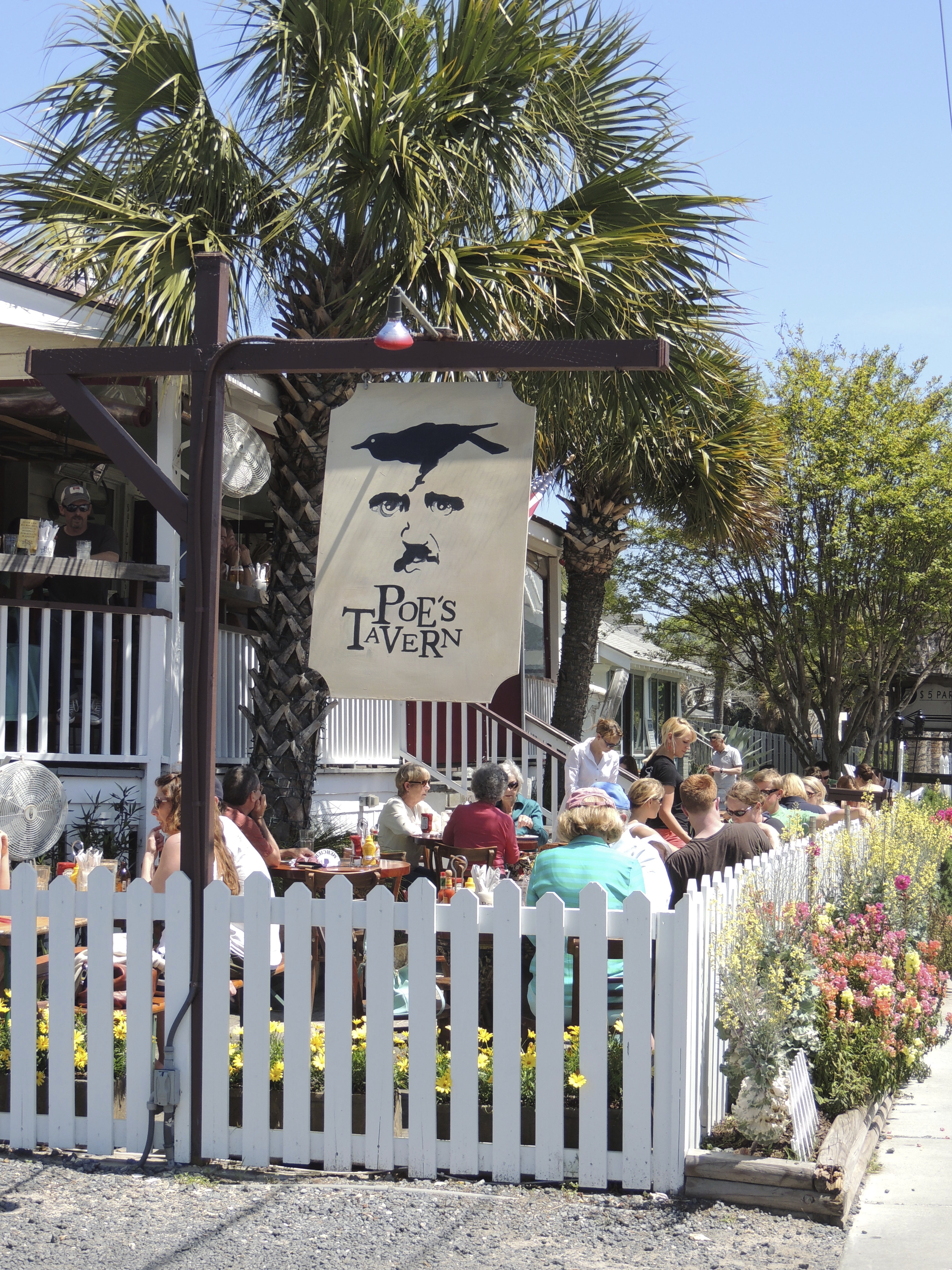 Sullivan’s Island, SC. One of the most beautiful places on earth. It has that “back in time” feeling. I would like to retire and live there (wouldn’t everyone)… beautiful homes, cool businesses, and of course, the ocean! Tucked in the small area of “town” is this wonderful restaurant that’s been around for about ten years now… it’s called POE’S TAVERN. Everything on the menu has an Edgar Allen Poe name to it, it’s so creative. The t-shirts are cool too, so if you make it there, check them out! Fabulous burgers and pretty much everything else! It’s fun to eat outside or in. It’s a happening place!