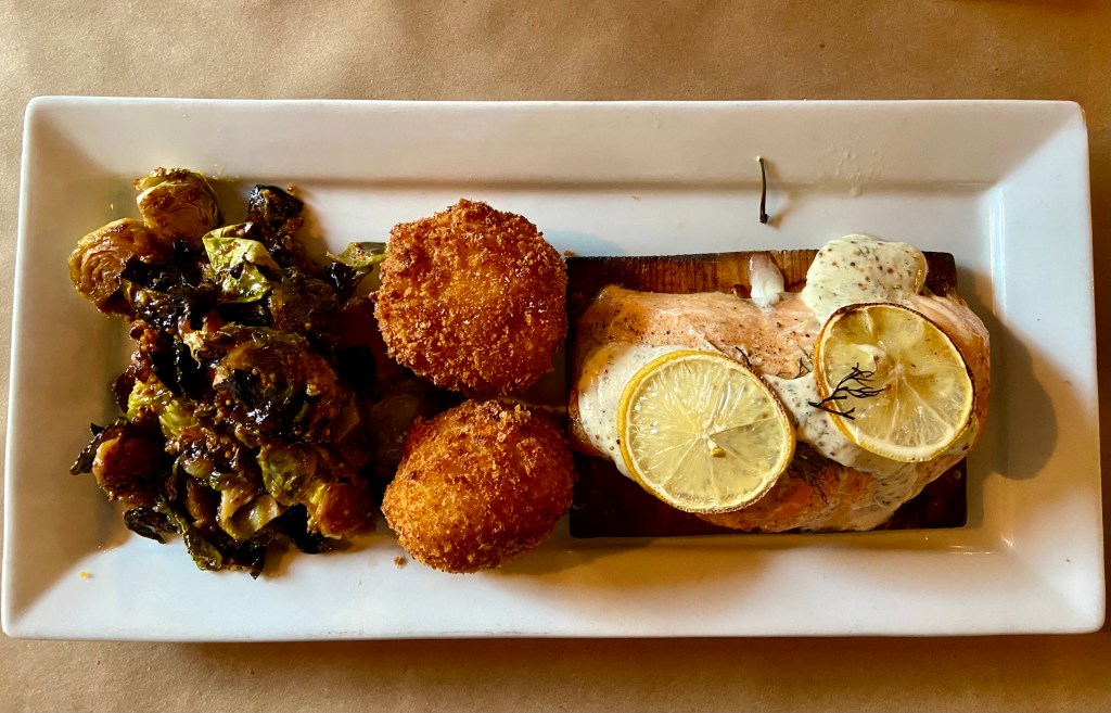 Candied Brussels Sprouts, Potato Croquettes and Wild Caught Dill Salmon (Cooked on a Cedar Plank)