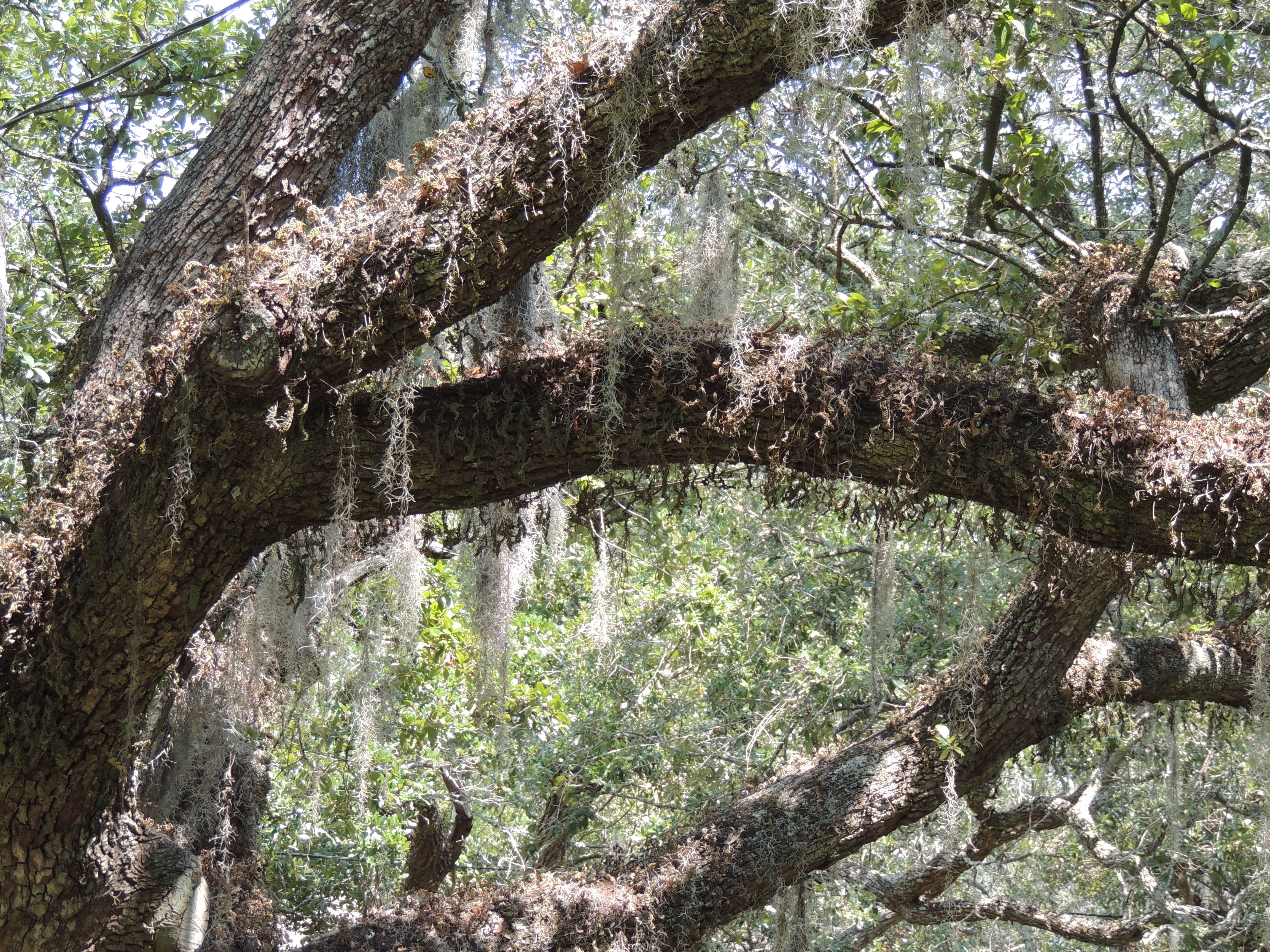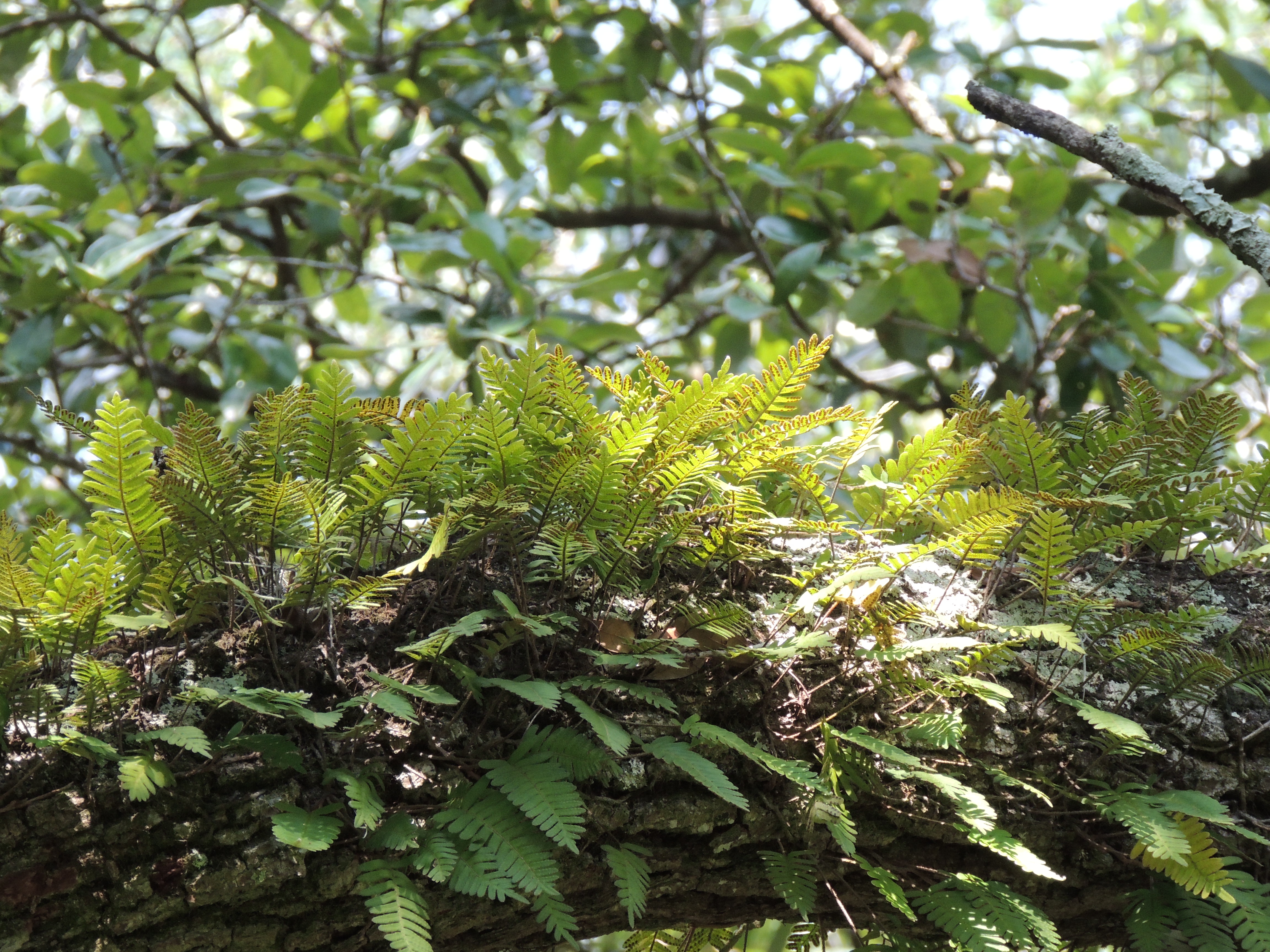 One morning a friend and I were walking our dogs as we normally do… we were talking about the ferns in the trees. It seems they were so lush and green and now they were dying. In the photo above you can see the top ferns are starting to turn brown. That night my husband and I took the dog around the blog. I was telling him about the ferns in the trees turning brown. We looked up, and there they were, as lush and green as ever. Ok… did I just dream that my friend and I had talked about the ferns turning crispy brown and dying in these large old oak trees? Google saved my sanity! I Googled “Resurrection Fern”… it wasn’t my imagination WOOHOO, the ferns turn brown and appear to be dead. When it rains they’re rehydrated and turn a lush green without a speck of brown! It is the most amazing thing! I read a neat ARTICLE that explains it. Apparently there is a special protein the resurrection fern has called DEHYDRIN which allows it to become lush and green only hours after receiving rain/water! These ferns last up to 100 years!