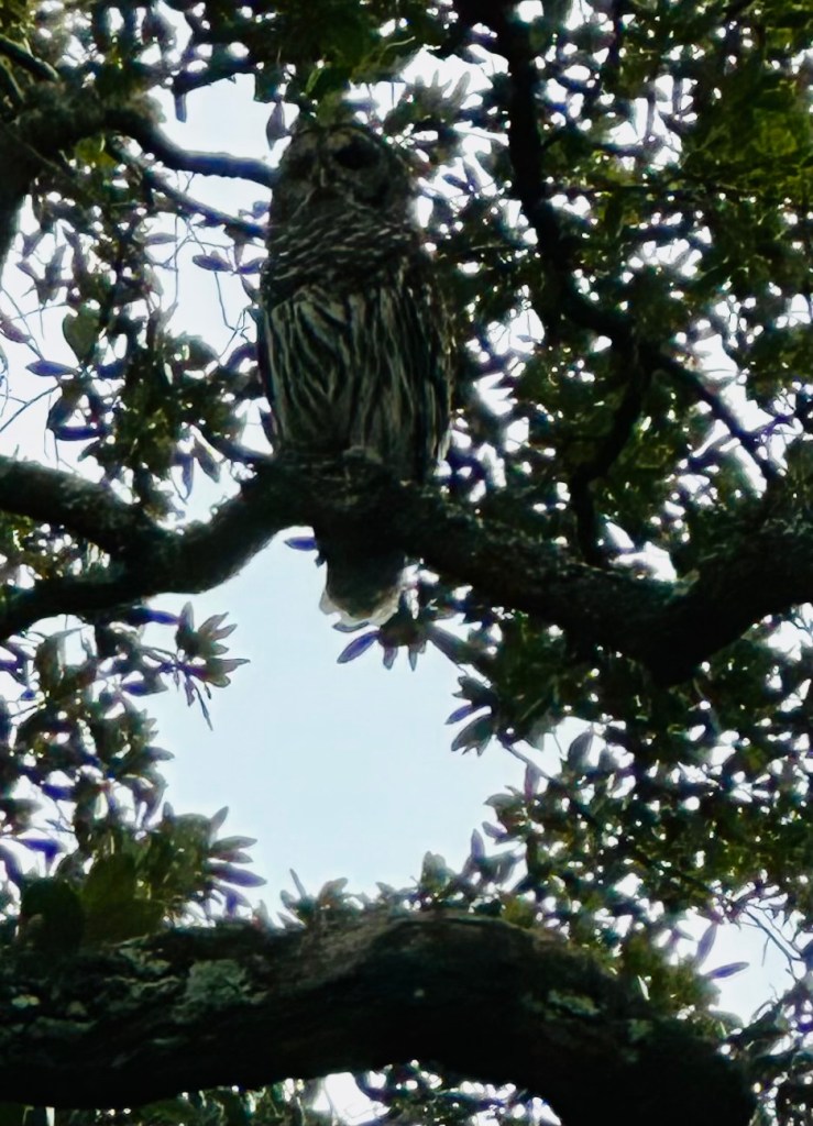 We have a neighborhood Barr Owl that gets around. He’s busy and always on watch. He demands presence – he isn’t the sweet little “hootie” that we rescued years ago and rushed to the Birds of Prey to save after we found him in our backyard leaning against the fence. This guy is a bit more territorial…