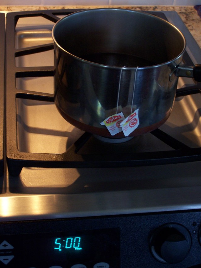 Turn the burner off. Add two FAMILY SIZE tea bags and dip em around good… then set the timer for 5 minutes… gives em time to get a nice hot soak…