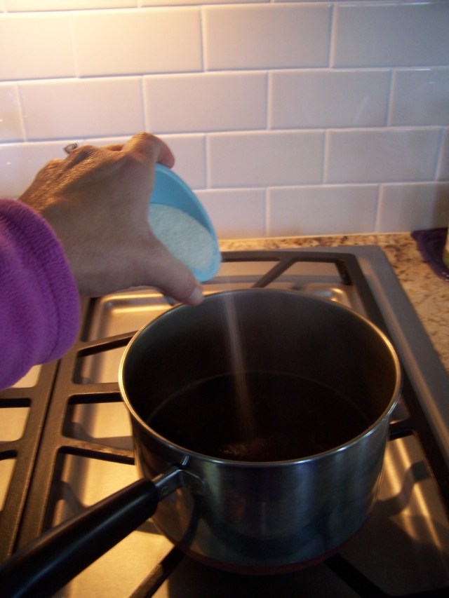 Now give it a good stir, kinda like Jello, need to stir in the sugar… don’t want to crunch! Now let it cool a bit…