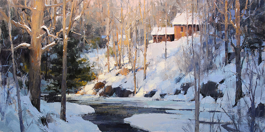 Isn’t this painting fabulous? It captures a scene in North Carolina so perfectly. The stream leads your eye to the fabulous trees in the distance which then goes on to that little spot of orange brilliance behind the tree towards the top and on to the dark limbs of the evergreen trees. This painting is so lovely you just don’t want to look away.